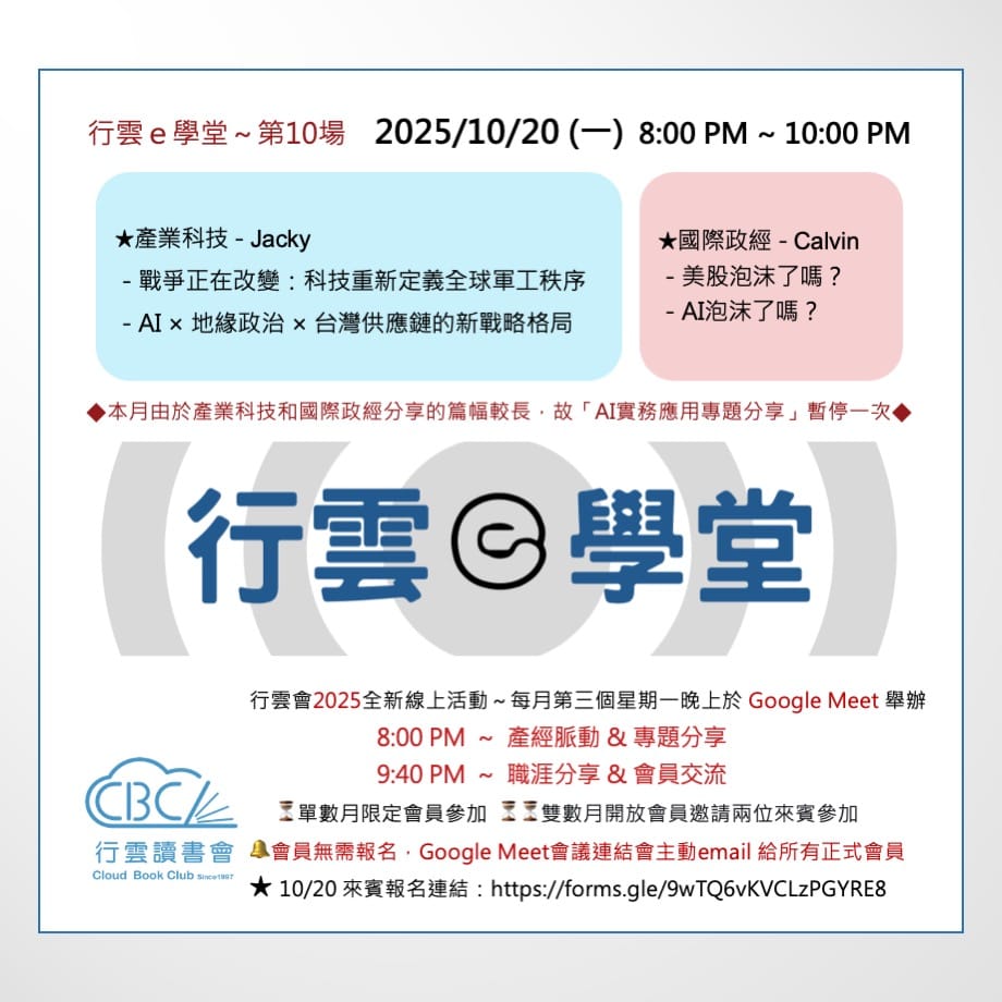 ★產業科技 - Jacky -戰爭正在改變:科技重新定義全球軍工秩序 -AI × 地緣政治 × 台灣供應鏈的新戰略格局 ★國際政經 - Calvin -美股泡沫了嗎? -AI泡沫了嗎? ◆本月由於產業科技和國際政經分享的篇幅較長,故「AI實務應用專題分享」暫停一次 會員無需報名,Google Meet會議連結會主動email 給所有正式會員