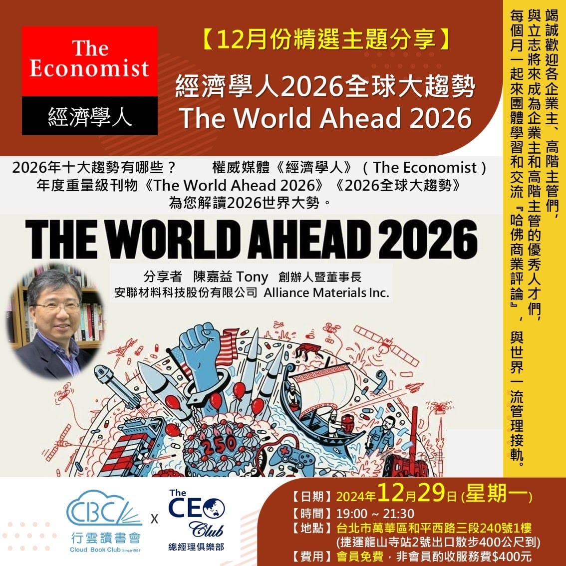2025/12/29(一) CBC行雲讀書會【總經理俱樂部】2025年【12月份精選主題】《經濟學人2026全球大趨勢 -The World Ahead 2026 》探討解析實體分享會