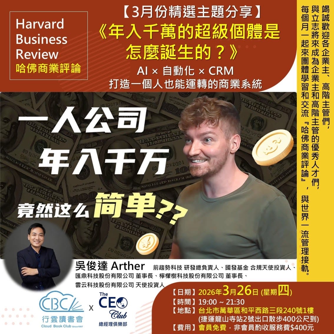 2026/3/26(四) CBC行雲讀書會【總經理俱樂部】2026年【3月份精選主題】《年入千萬的超級個體是怎麼誕生的? 》實體分享會